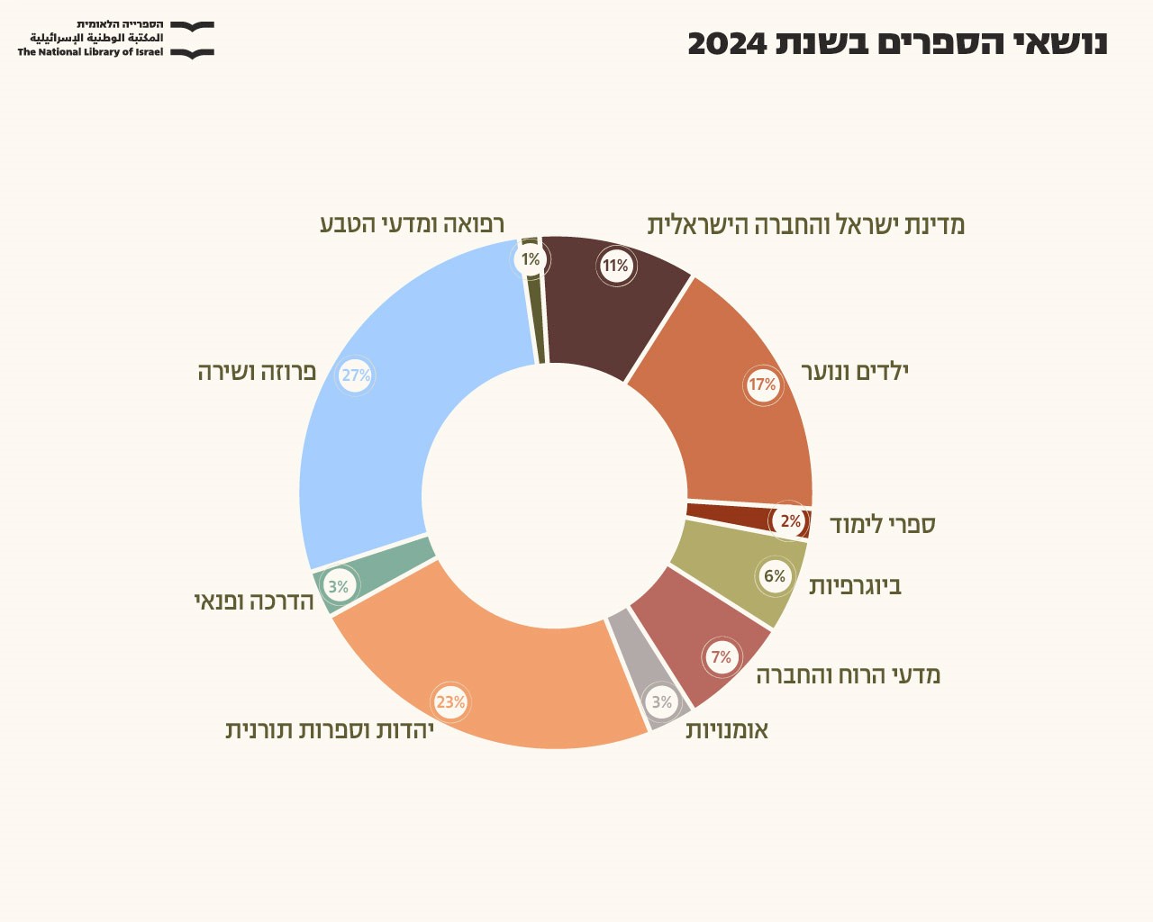 במהלך שנת 2024 נקלטו בספרייה הלאומית 6,928 ספרים מודפסים, עלייה משמעותית משנת 2023, שבה יצאו לאור 6,037 ספרים. עליה זו באה לידי ביטוי בסוגות רבות: בפרוזה, בספרים לילדים ונוער, בתחום הספרות התורנית ומדעי היהדות וכן בכתיבת ספרים רבים העוסקים במתקפת 7 באוקטובר, במלחמה ובהשלכותיה הרבות על החברה הישראלית ויהדות התפוצות.