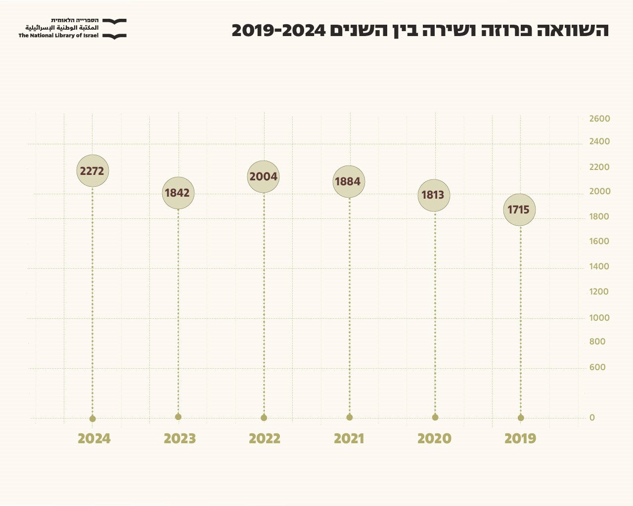 אולם השנה גם נשבר שיא – 2,272 ספרי פרוזה, סיפורת ושירה יצאו לאור בשנה האחרונה – מספר גבוה גם לעומת שנת 2023 – בה יצאו "רק" 1,842 ספרים (כאמור, הפצה של רבים מהספרים שתוכננו לצאת בסוף 2023 התעכבה בשל המלחמה ונדחתה לשנת 2024 ). אך המספר השנה גבוה באופן משמעותי גם משנת 2022 שבמהלכה יצאו לאור 2,004 ספרי פרוזה, ומשנת 2020 שבה התפרסמו 1,813 ספרים בסוגה זו.