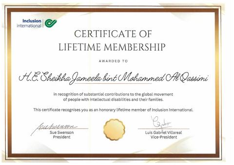 שייח'ה ג'מילה אל קאסימי הצהירה כי הענקת חברות כבוד לכל החיים על ידי Inclusion International מייצגת הכרה מכובדת באמירות שארג'ה, בהנהגת שליט שארג'ה, שמנהיגותו בעלת החזון הקימה מסגרת הומניטרית מושרשת המבוססת על צדק והעמידה בעקביות בראש סדר העדיפויות את זכויותיהם ורווחתם של אנשים עם מוגבלות.
