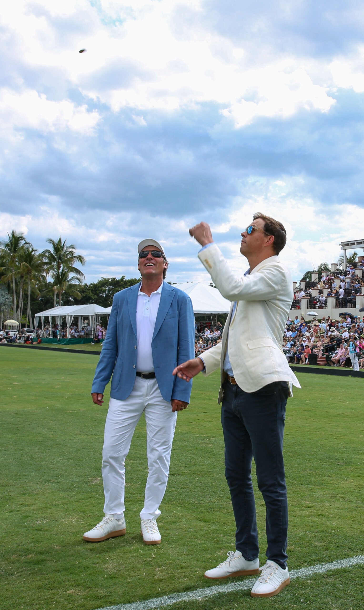 בוב בריאן (מימין), אחד משחקני טניס הזוגות הגדולים בכל הזמנים, לצד שחקן הטניס המקצועי של מרכז הפולו הלאומי של USPA, סקוט וויליאמס (שמאל), עורכים את הטלת המטבע הטקסית לפני המשחק בגמר אליפות הפולו הפתוחה של ארצות הברית. – צילום Agustina Fonda