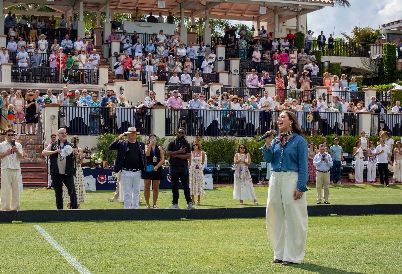 אמנית הקאנטרי מנאשוויל, אבי קון, שרה את ההמנון הלאומי בפני קהל שובר שיאים בגמר אליפות ארצות הברית הפתוחה בפולו במרכז הלאומי לפולו של USPA-צילום Agustina Fonda